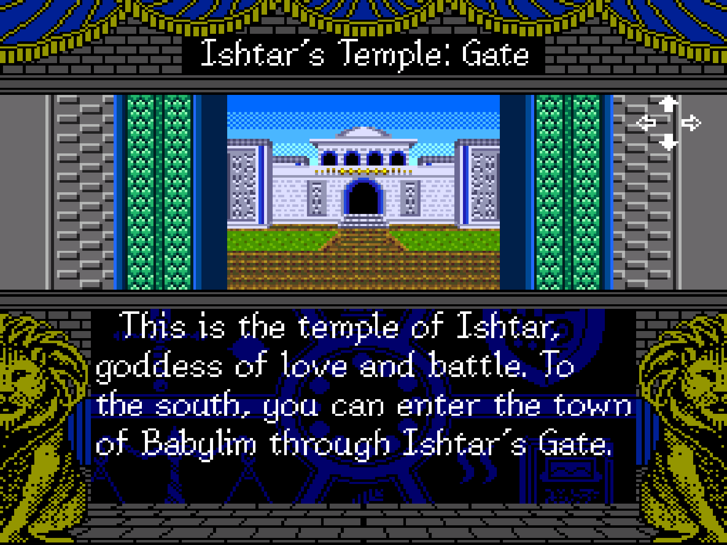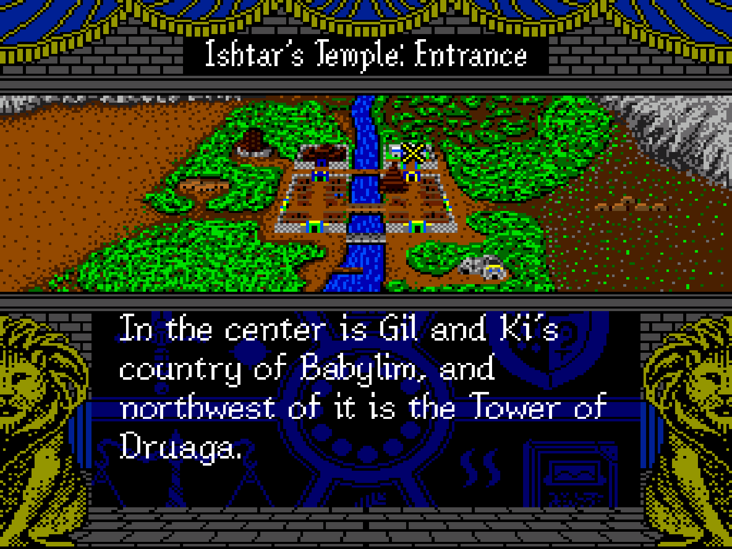 - Ishtar's Temple (イシター神殿) - A temple dedicated to the goddess Ishtar, located northeast of the town. The player starts here, and in most story paths the temple is also the last place visited, from where Gil and Ki can reach Anu in the sky to return the Blue Crystal Rod. Besides the goddess Ishtar, the temple also has a guru named Terrazi (テラジ Teraji) that gives gameplay advice. The Ishtar Gate can be seen in front of the temple.