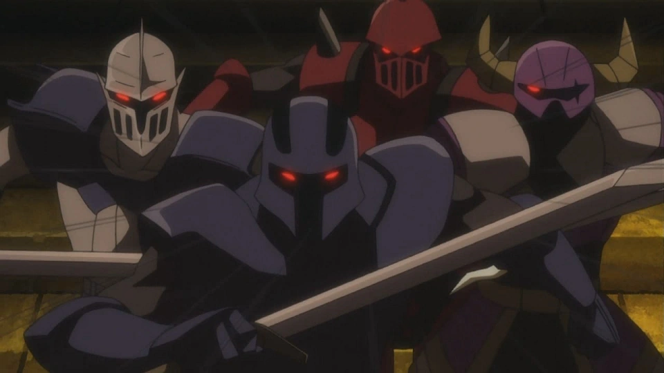 The five standard knights appeared in Jil's dream in the first episode of The Tower of Druaga: The Aegis of Uruk. When going to the Tower of Druaga, Jil's party faces a Black Knight. Jil defeats the knight and spares his life. The Black Knight later returns to save Jil from the dragon Quox, saying that he is the one that is going to defeat Jil, but is killed by Quox. After Quox's defeat, the "The Druaga Three" (ドルアーガ参人衆, miscounted by them) Blue Knight, Mirror Knight, Hyper Knight, and Red Knight appear to face Jil, but the four are easily defeated by him. A Red Knight appears in a flashback in episode 3 fighting against Gilgamesh, and some knight types are mentioned in episode 8.