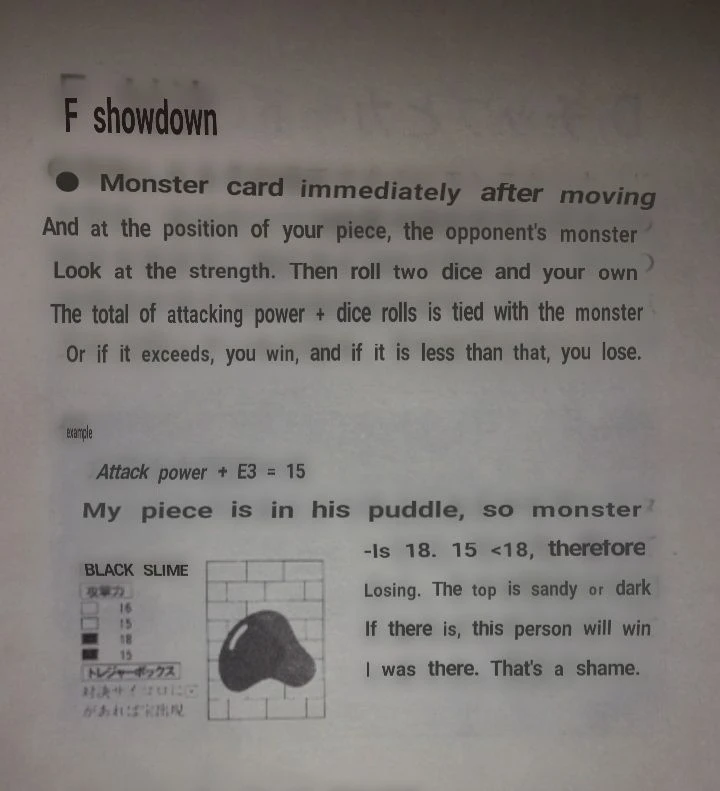 - Monster card are drawn immediately after moving, and at the position of your piece, the opponent's monster. Look at the strength. Then roll two dice and read your own stats. The total of attacking power + dice rolls is tied with the monster or if it exceeds, you win, and if it is less that, you lose.