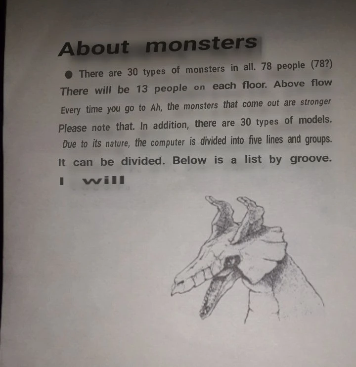 There are 30 types of monsters in all. 78 creatures. There will be 13 of them on each floor. Every time you go to a new floor, the monsters that came out are stronger. Please note that. In addition, there are 30 types of models. Due to its nature, the creatures are divided into five lines and groups. It can be divided.